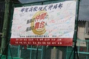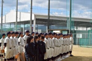最後は、グラウンドで神籐副部長、いつも那賀高野球部を応援して下さる岡田様をはじめ、林OB会長のご臨席を頂き、式典を行いました。お忙しい中、誠にありがとうございました。卒部生一人一人、笑顔での入場がとても素敵でした。2年生キャプテンからの送る言葉、3年生が後輩に夏への思いを託しました。