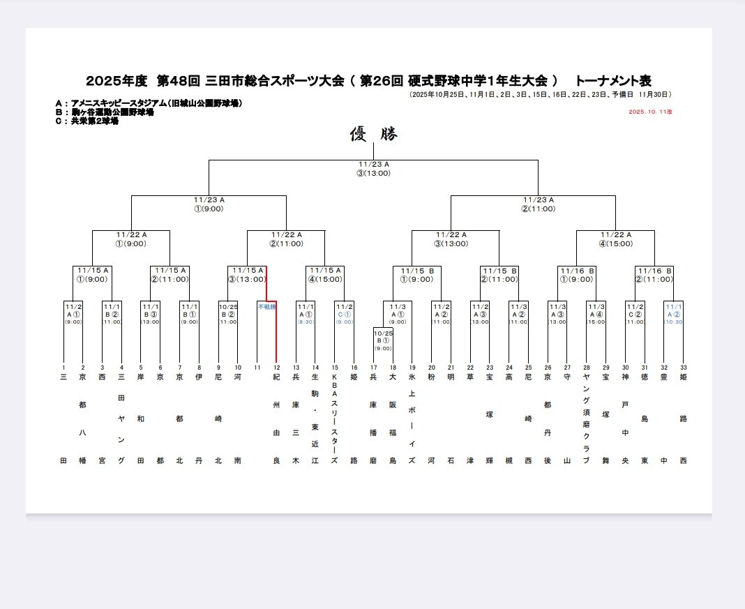 ※10月25日(土)に予定されておりました初戦は不戦勝となり、三回戦からの参加となりました。